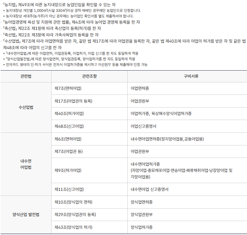 📋 준비서류 신분증, 농업경영체 등록증 또는 어업인 증명서