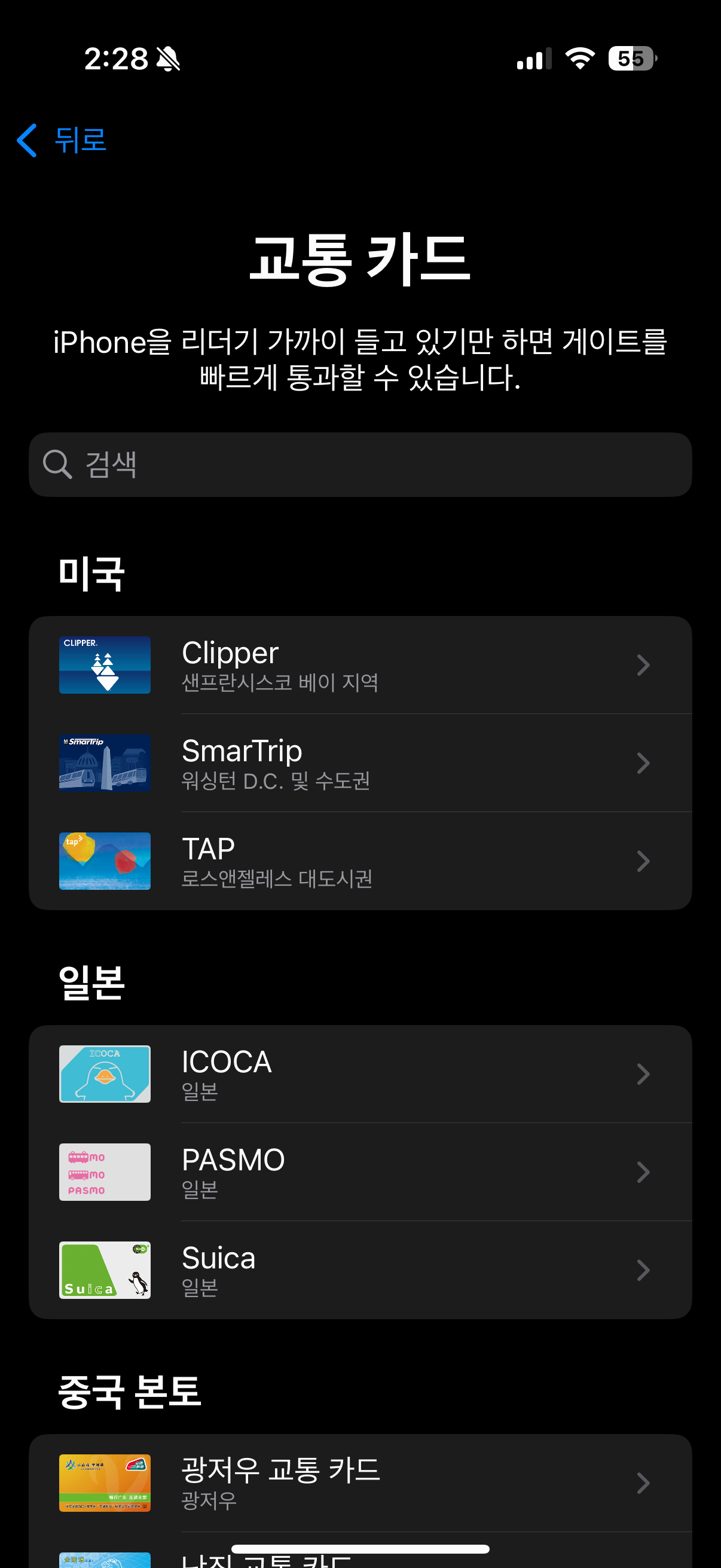 현재는 미국, 일본, 중국본토, 캐나다, 프랑스, 홍콩 교통카드를 추가 할 수 있습니다.